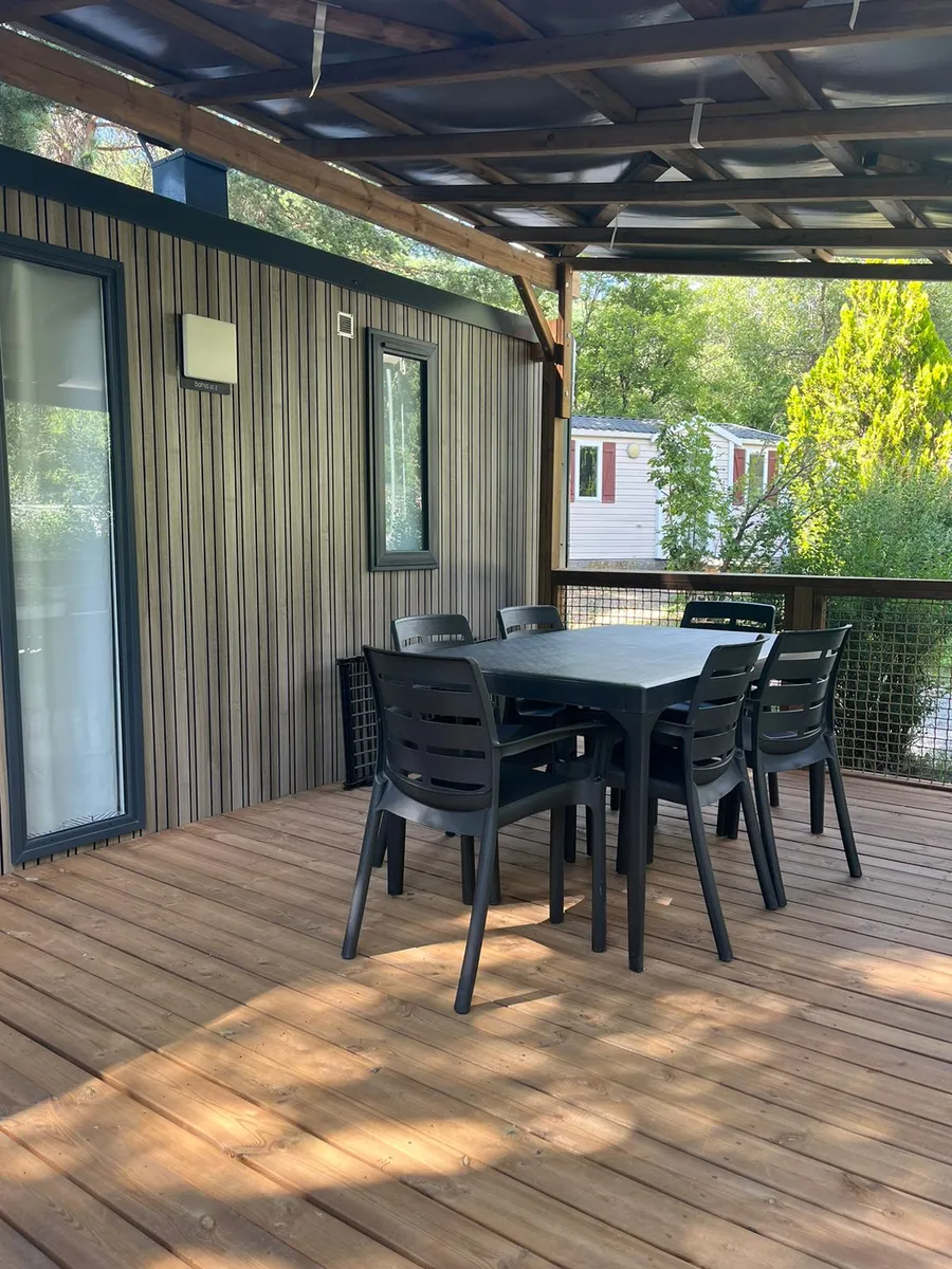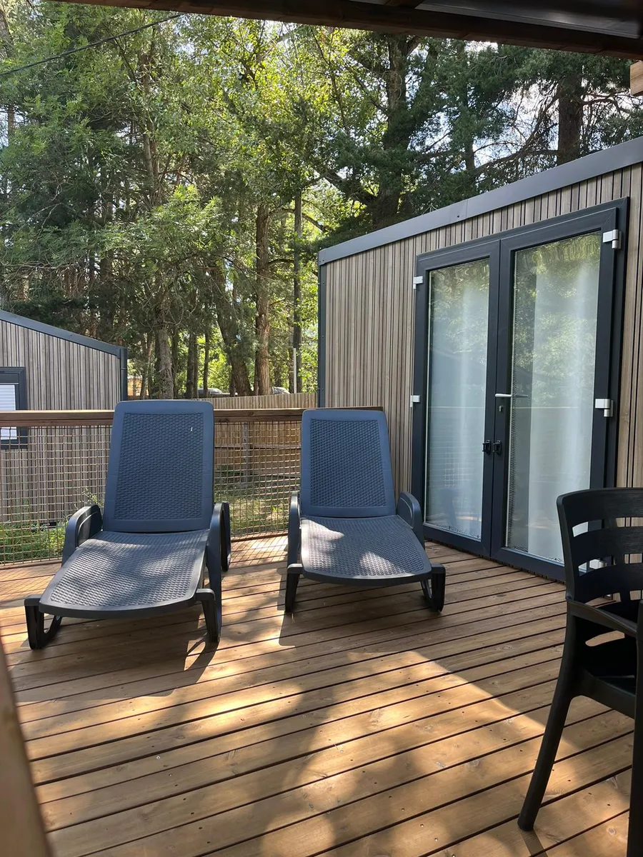 The outdoor terrace features wooden garden furniture and deckchairs.