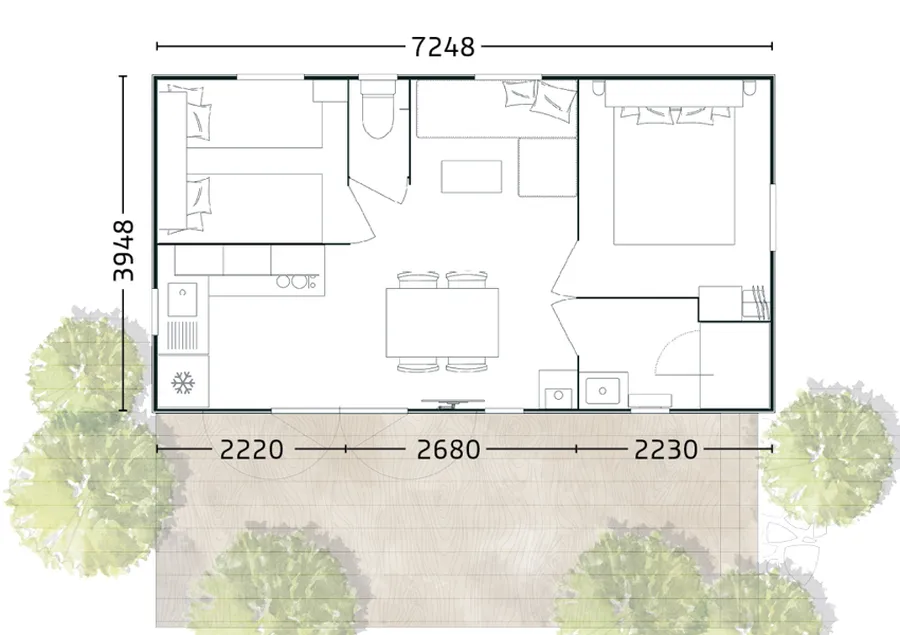 The bedrooms are located on either side of the mobile home; a master bedroom with a 160 cm bed and a bedroom with two single beds.